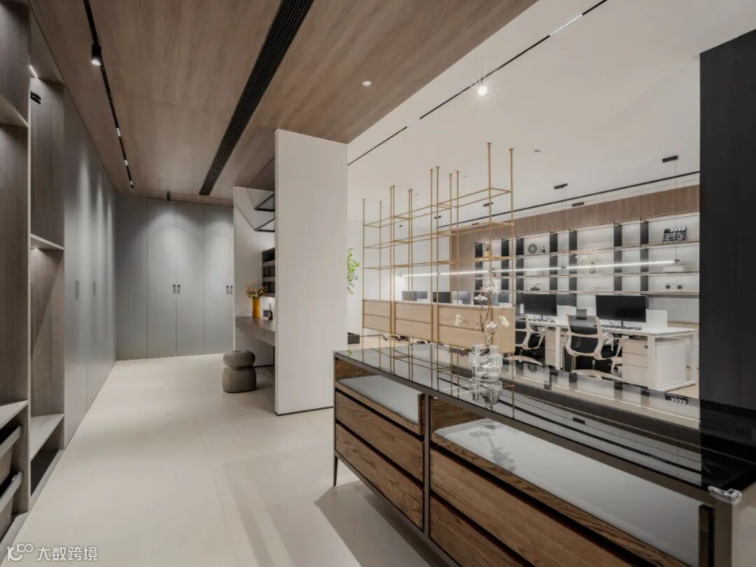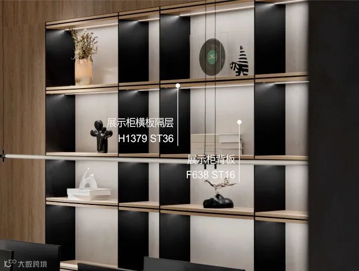 办公桌背后的展示柜,背板使用爱格F638 ST16 铬金属银灰花色,横隔板选择H1379 ST36棕色奥尔良橡木花色,并使用铝木工艺打,配合灯光,摆上工艺品、书籍,设计艺术感立马得到体现。