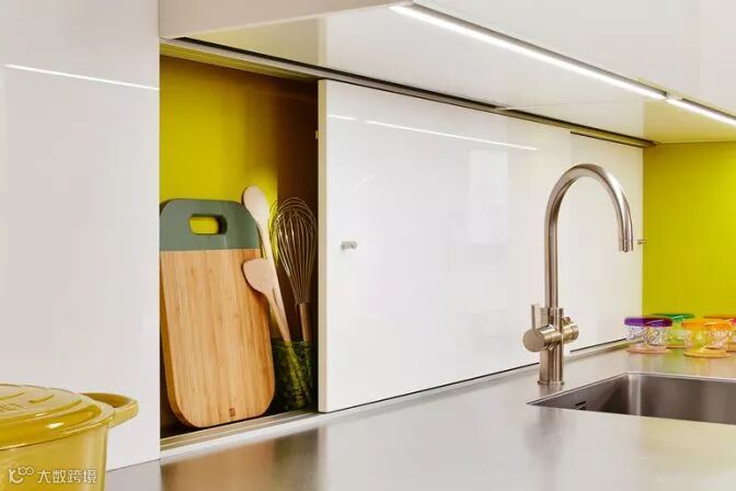 多功能墙壁收纳系统,将调料、刀具、案板都隐藏其中,打开,包罗万有,合上,一片清净。