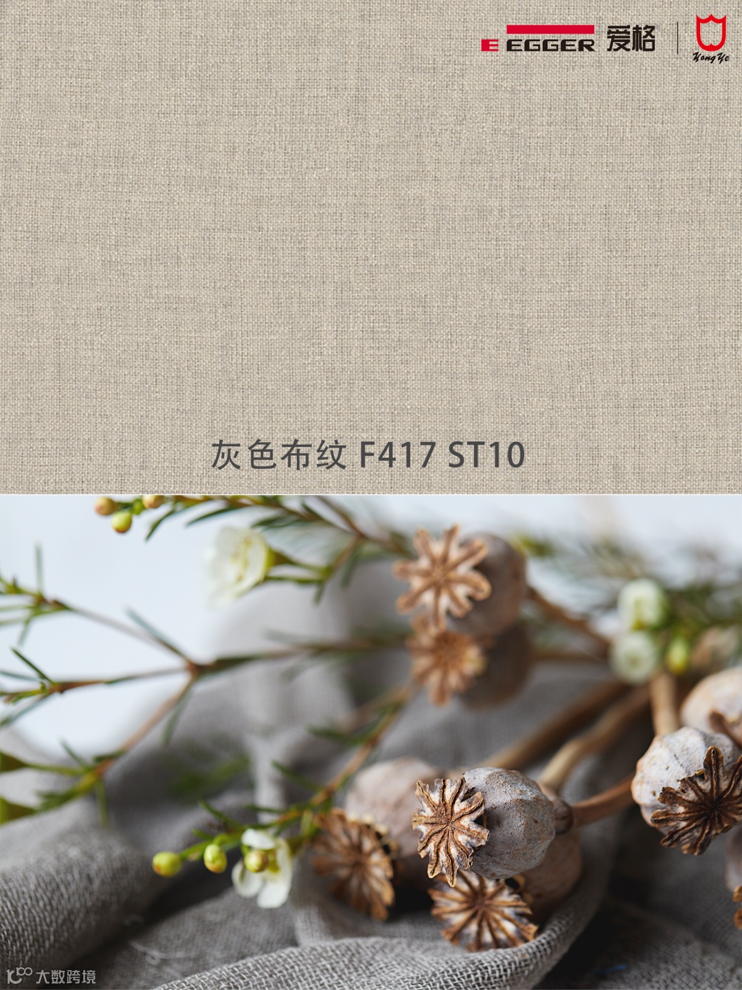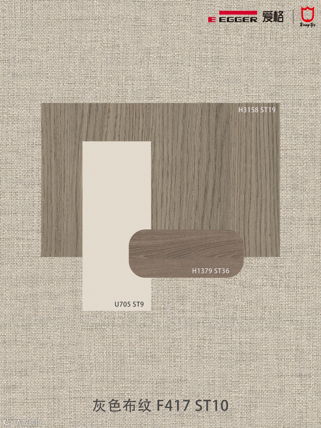 F417 ST10灰色布纹具有相对粗糙的布纹设计,具有很强的编织物的质感。其表面纹理 ST10粗砺深压纹恰到好处地还原了布纹的粗砺感,赋予了花色自然质朴、轻快舒适的感官。