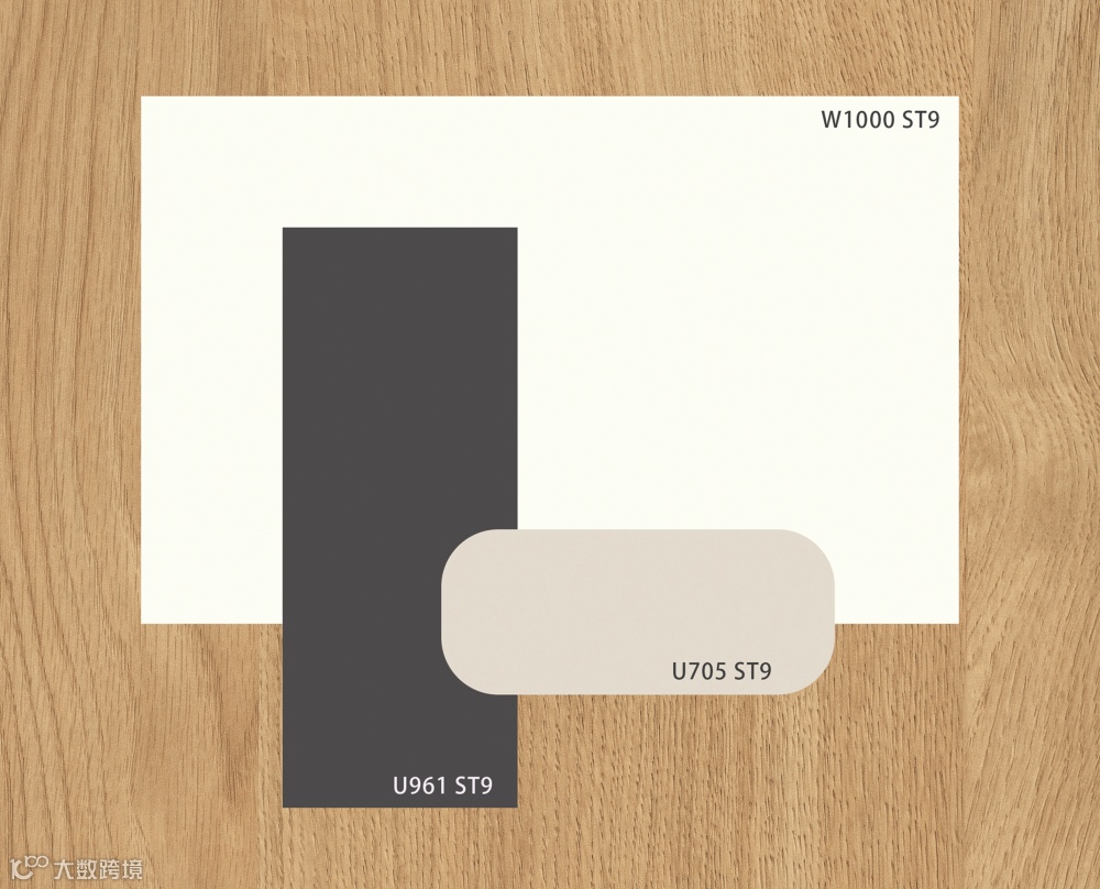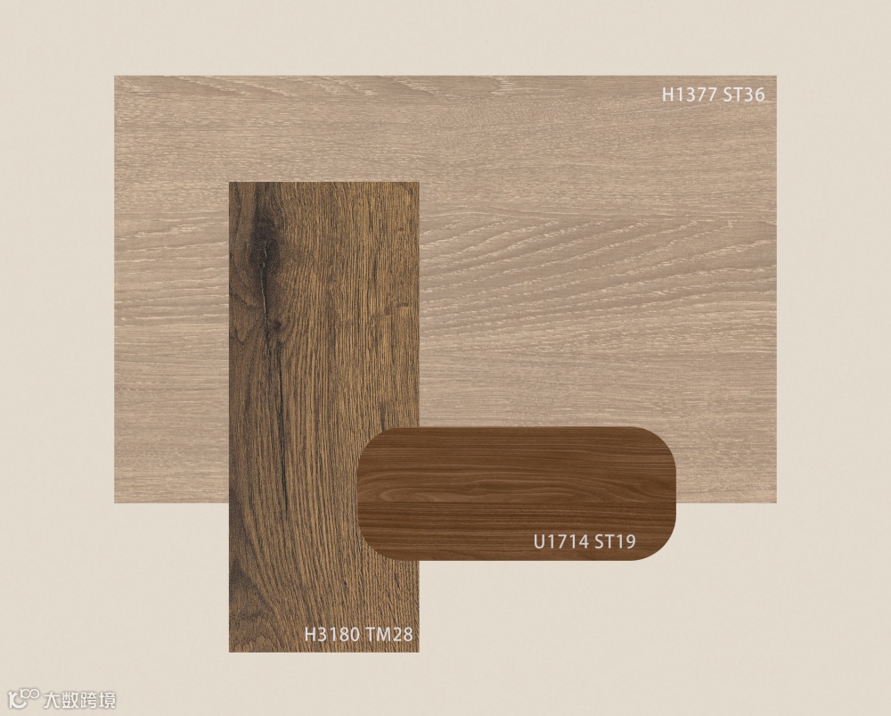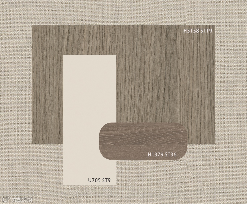 灰色布纹适合与暖灰色系木纹花色以及单色搭配,比如与H3158 ST19灰色维琴察橡木、H1379 ST36棕色奥尔良橡木及U705 ST9安哥拉灰的搭配,可以营造出舒适雅致的现代空间。