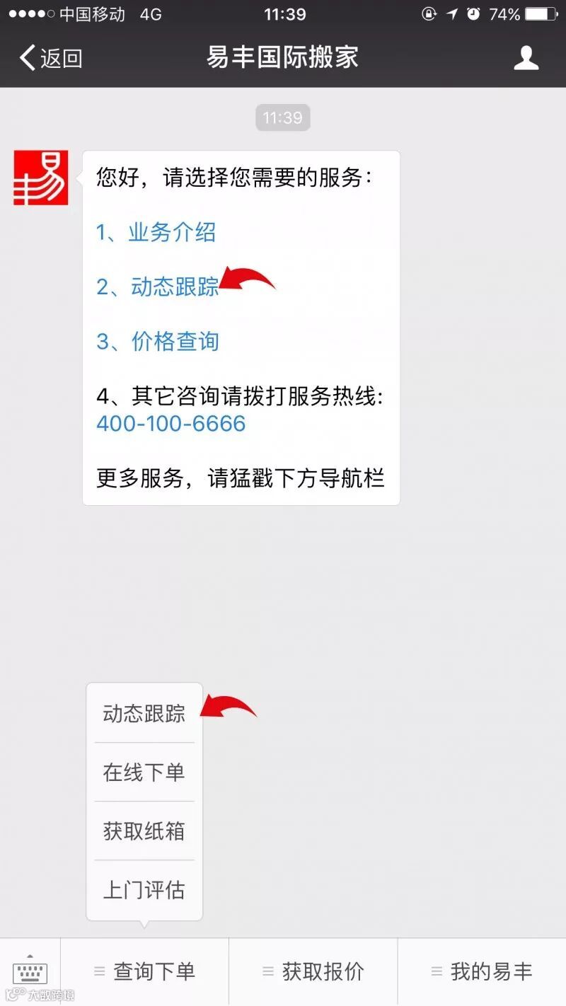 现在很多客户宁愿手机操作,也不愿意打电话问客服查询货物动态,易丰搬家为了满足不同客户的需求,让想知道自己货物动态的客户,既可以拨打全国热线:400-100-6666,电话咨询客服;又可以在“易丰国际搬家”公众平台里面10秒轻松搞定。