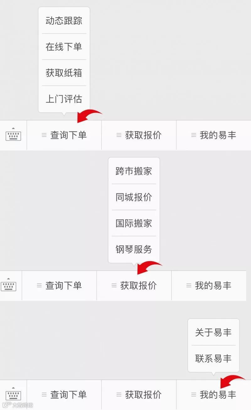 易丰搬家微信公众平台易丰国际搬家(微信号:YifengMoving)现已推出“动态跟踪”“在线下单”“获取报价”“获取纸箱”“上门评估”等新功能,想获取更多搬家资讯,自助获取,10秒轻松搞定!