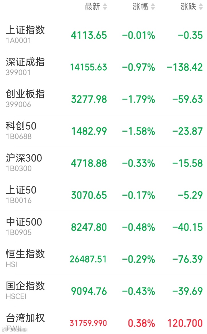 1、A股:周二A股震荡调整,市场风格呈现从高估值成长板块向价值板块切换的特征,上证指数收跌0.01%报4113.65点,深证成指跌0.97%,创业板指跌1.79%,万得全A跌0.58%,市场成交额升至2.8万亿元,上日为2.73万亿元。盘面上,卫星互联、CPO、商业航天、通信概念股领跌,培育钻石、房地产、石化、贵金属板块涨幅居前。