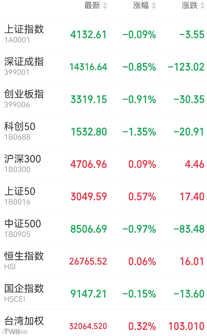 1、A股:周一A股震荡走低,上证指数收跌0.09%报4132.61点,深证成指跌0.85%,创业板指跌0.91%,北证50跌1.45%,万得全A跌0.68%,市场成交额升至3.28万亿元,上一交易日为3.12万亿元。盘面上,有色、贵金属概念涨幅居前,生物疫苗、油气股走高;大消费集体下挫,商业航天概念股集体熄火。宽基指数ETF成交持续活跃,沪深300ETF华泰柏瑞成交额达280亿元。