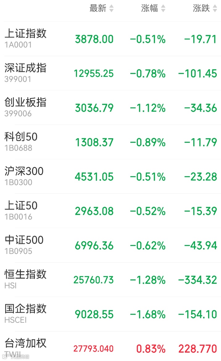1、A股:A股震荡下挫,上证指数收盘跌0.51%报3878点,深证成指跌0.78%,创业板指跌1.12%,市场成交额1.68万亿元。AI应用、锂电池题材领跌,锂电池产业链全面走低;煤炭板块集体走高,超硬材料概念股爆发,医药商业板块持续活跃。