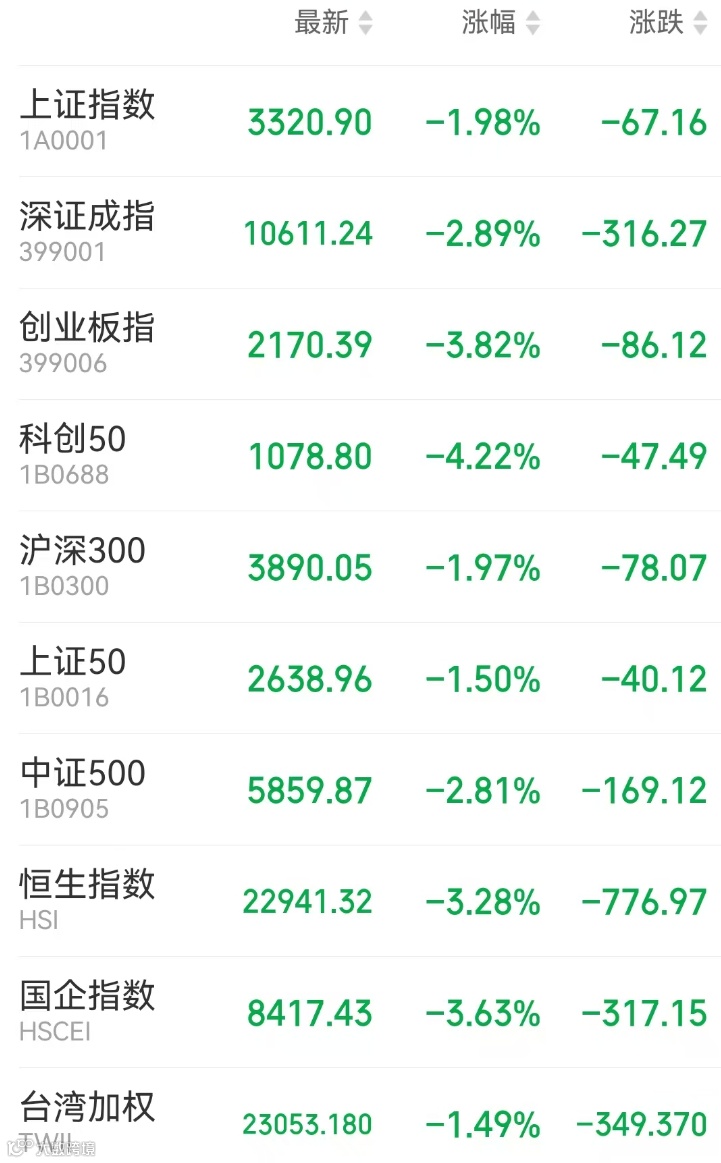 1、A股:A股三大指数单边下行,题材股悉数哑火,AI硬件、AI应用、机器人方向领跌。上证指数收跌1.98%报3320.9点,深证成指跌2.89%,创业板指跌3.82%,北证50跌4.32%,科创50跌4.22%,万得全A跌2.72%,万得A500跌2.01%,中证A500跌2.25%,市场成交1.91万亿元,逾4700股下跌。2月,上证指数累计涨2.16%,深证成指涨4.48%,创业板指涨5.16%。