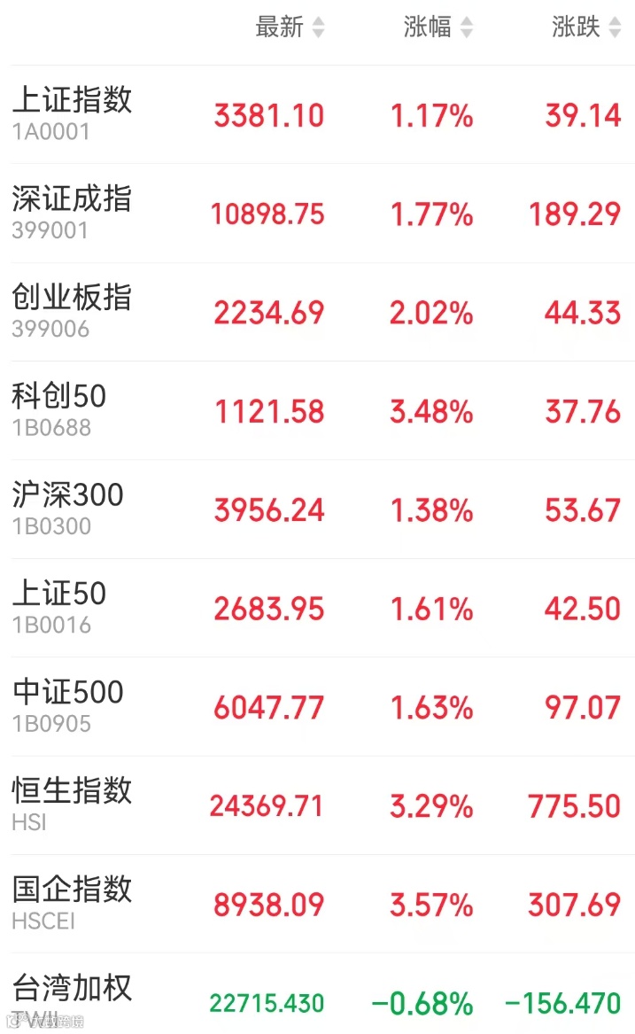 1、A股:A股三大指数高开后单边上行,TMT行业领涨,AI智能体、信创方向掀涨停潮。上证指数收涨1.17%报3381.1点,深证成指涨1.77%,创业板指涨2.02%,北证50跌1.46%,科创50涨3.48%,万得全A涨1.62%,万得A500涨1.41%,中证A500涨1.56%,市场成交1.95万亿元,近4300股上涨。
