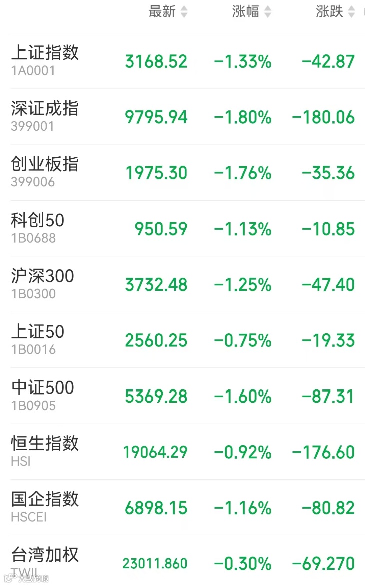 1、A股:上周五A股全天弱势震荡,上证指数再度失守3200点关口,市场4800股下跌,尾盘跌停个股数量显著增加。截止收盘,上证指数跌1.33%报3168.52点,深证成指跌1.8%,创业板指跌1.76%,北证50跌2.78%,科创50跌1.13%,万得全A跌1.81%。市场成交额1.16万亿元。上周沪指累跌1.34%,深成指跌1.02%,创业板指跌2.02%。
