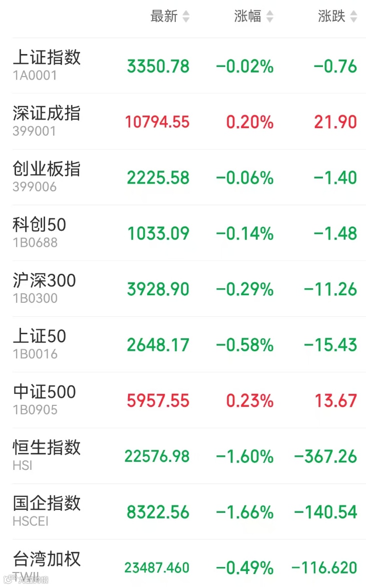 1、A股:A股三大指数窄幅整理,AI穿戴概念股爆发,人形机器人板块反复活跃,创新药、CRO、商业航天等表现抢眼;DeepSeek题材退潮。上证指数收跌0.02%报3350.78点,深证成指涨0.2%,创业板指跌0.06%,北证50涨1.49%,科创50跌0.14%,万得全A涨0.26%,万得A500跌0.24%,中证A500跌0.14%。市场成交1.79万亿元,逾3300股上涨。