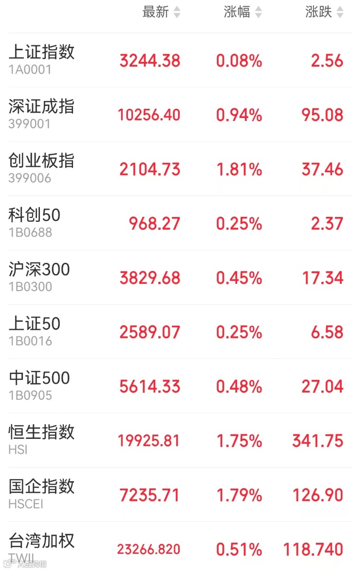 1、A股:周一A股震荡收涨,高速铜连接、PCB持续火热,红利资产普跌,小红书概念继续回调。截止收盘,上证指数涨0.08%报3244.38点,深证成指涨0.94%,创业板指涨1.81%,科创综指首秀涨0.36%,北证50涨0.24%,万得全A涨0.6%。市场成交额1.2万亿元。