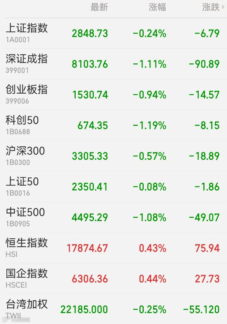 1、A股:A股震荡下跌,深成指、创业板指均创本轮调整新低,市场逾4000股下跌。地产股领跌,AI穿戴概念股深度回调,消费电子、车路云、通用航空、人工智能、锂电池等概念股跌幅靠前。石油、煤炭板块走强,房屋检测、猴痘病毒防治概念活跃,银行股相对强势,五大行股价再创新高。截至收盘,上证指数跌0.24%报2848.73点,深证成指跌1.11%,创业板指跌0.94%,科创50跌1.19%,北证50跌1.89%,万得全A跌0.93%,万得A500跌0.72%。市场成交额5141.4亿元。