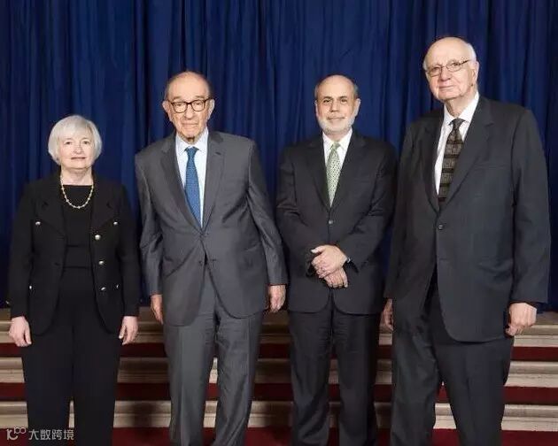 (图说:四任美联储主席——从左到右依次为耶伦,格林斯潘,伯南克和沃克尔)