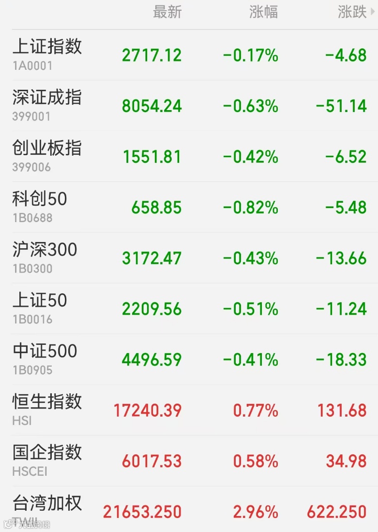 1、A股:A股冲高回落,大消费跌势未止,贵州茅台、泸州老窖双双创阶段新低,国企改革概念持续活跃,海南板块领涨题材。截至收盘,上证指数跌0.17%报2717.12点,深证成指跌0.63%,创业板指跌0.42%,万得全A跌0.36%,万得A500跌0.4%。市场成交额5174.3亿元,环比略增。
