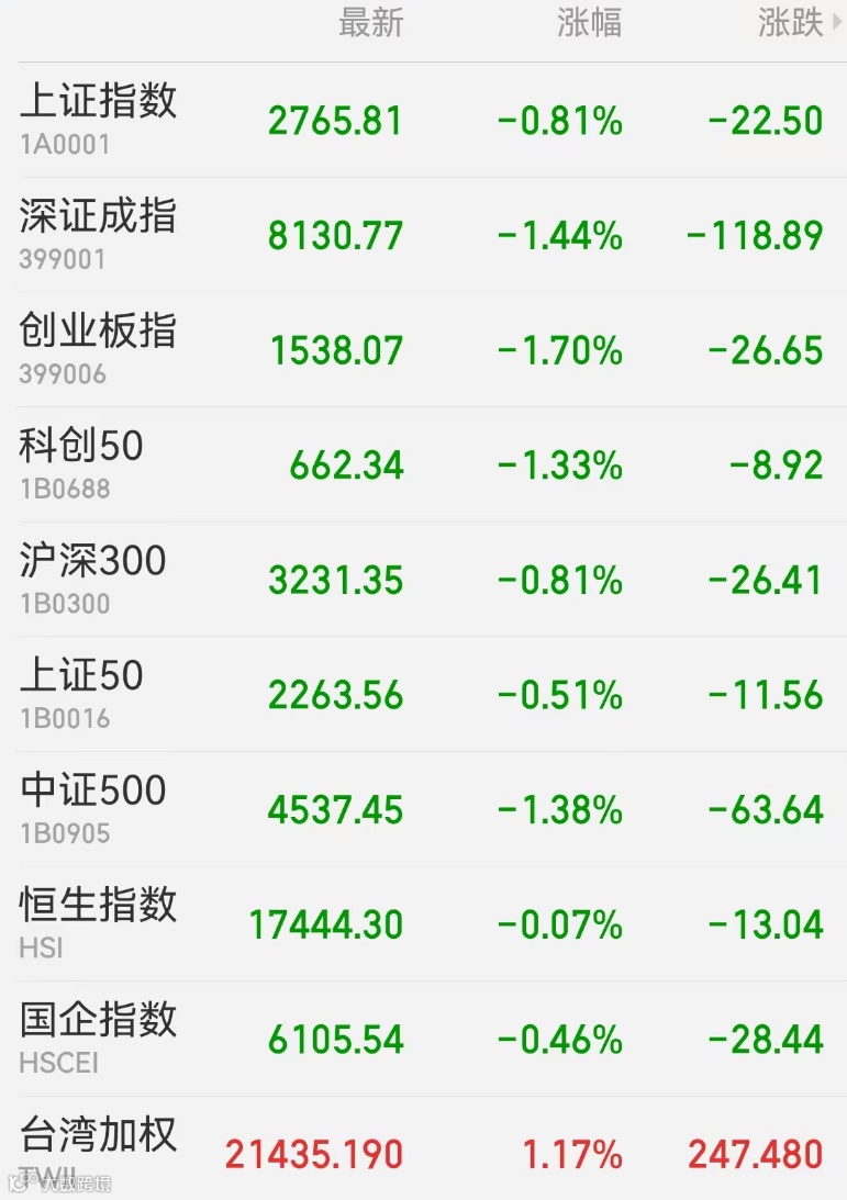 1、A股:A股三大指数震荡下挫,沪指续创本轮调整新低,场内超4700股飘绿。苹果产业链、高速铜连接、光伏、CRO等概念股集体下探,通信、机械、教育、煤炭等行业亦表现疲软。特斯拉FSD落地消息提速,智能驾驶概念风云再起;国泰君安筹划以吸收换股方式合并海通证券,券商板块走强,天风证券、国海证券涨停。截至收盘,上证指数跌0.81%报2765.81点,深证成指跌1.44%,创业板指跌1.7%,科创50跌1.33%,北证50跌1.87%,万得全A跌1.22%,万得A500跌0.97%。市场全天成交5450亿元。上周沪指累跌2.69%,深成指跌2.61%,创业板指跌2.68%。