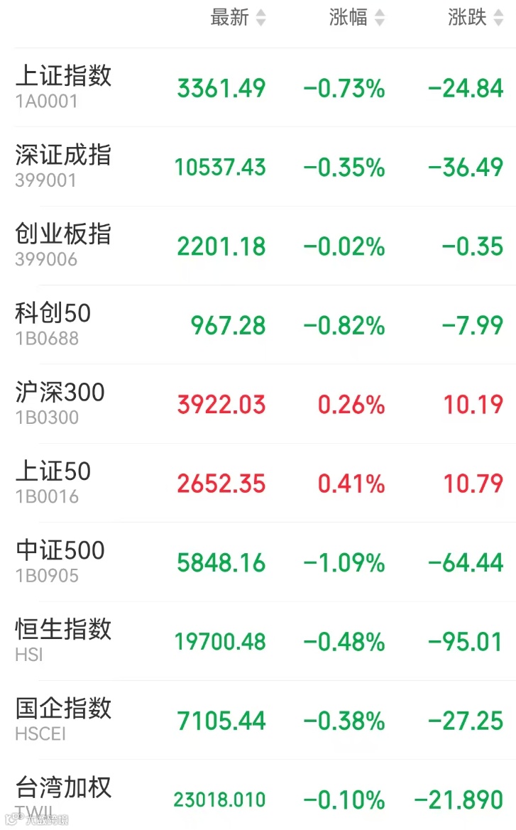 1、A股:上证指数报3361.49点,下跌0.73%,成交额5847.89亿。深证成指报10537.43点,下跌0.35%,成交额9255.68亿。创业板指报2201.18点,下跌0.02%,成交额3972.65亿。总体上个股跌多涨少,全市场超4700只个股下跌。两市成交额1.51万亿,较上个交易日缩量1894亿。盘面上,足球概念、元件、白酒等少数板块上涨,影视、IP经济、冰雪产业、零售等板块跌幅居前。