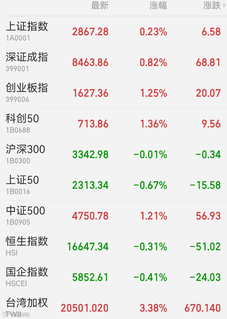 1、A股:A股缩量小幅反弹,光伏、医药发力,大金融萎靡。上证指数收盘涨0.23%报2867.28点,盘中再创阶段新低;深证成指涨0.82%,创业板指涨1.25%,万得全A涨0.77%,万得A500涨0.25%。市场成交额不足6600亿元,北向资金净卖出62.51亿元。