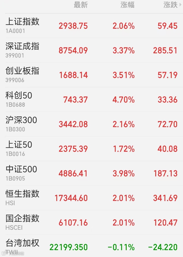 1、A股:A股7月放量大涨收官,全天超5000股上涨。截至收盘,上证指数涨2.06%报2938.75点,深证成指涨3.37%,创业板指涨3.51%,科创50涨4.7%,万得全A涨2.93%,万得A500涨2.55%。券商股强势爆发,市场再传中金公司、中国银河将合并,但双方均表示未听说相关消息。市场成交额回升至9000亿元上方,为5月20日以来首次。北向资金净买入195.8亿元,创3个月新高。受访券商首席和公募机构表示,在宏观政策要“持续用力、更加给力”背景下,A股市场积极因素由量变转向质变,下半年反转行情可期。