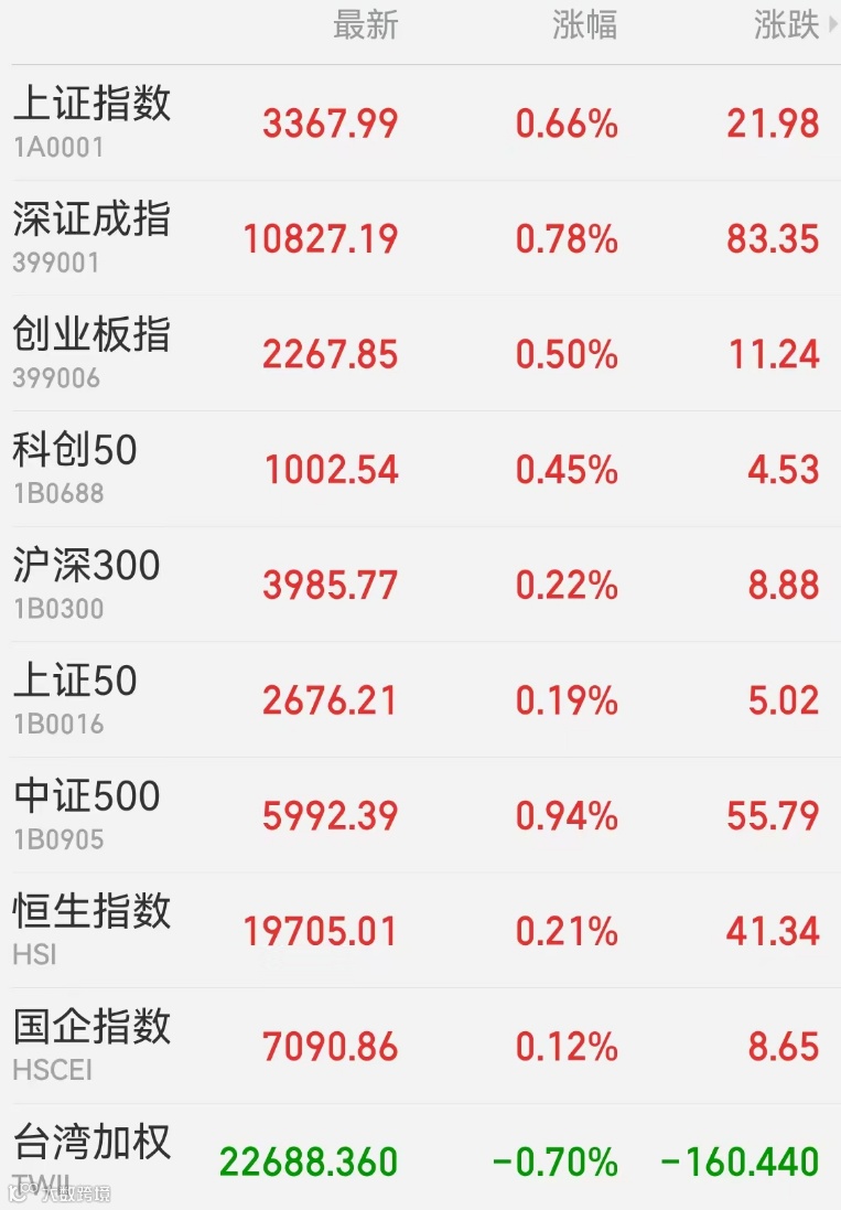 1、A股:周三A股低开高走,全天超4500股飘红,AI应用端全线反弹,磷化工、医疗信息化、机器人、固态电池板块表现抢眼,红利资产逆势飘绿,光伏、芯片板块跑输大盘。名称炒作重出江湖,“东方”系获资金追捧。截至收盘,上证指数涨0.66%报3367.99点,深证成指涨0.78%,创业板指涨0.5%,北证50涨3.07%,科创50涨0.45%,万得全A涨1.11%,万得A500涨0.35%,中证A500涨0.49%。市场成交额1.65万亿元,环比略增。