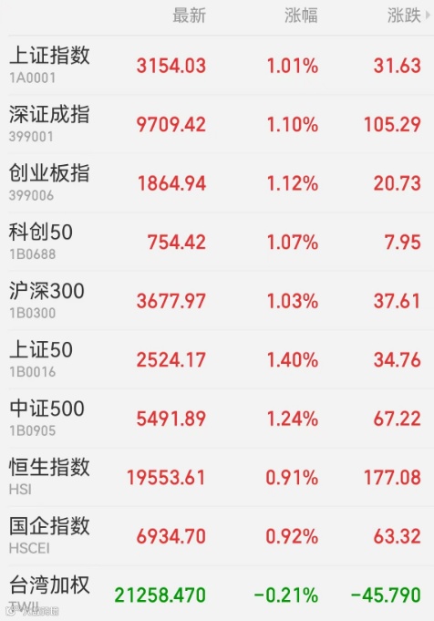 1、A股:A股早盘震荡整理,午后受楼市组合政策提振,房地产板块全线爆发,金融股同步攀升。上证指数收涨1.01%报3154.03点,深证成指涨1.1%,创业板指涨1.12%,科创50指数涨1.07%,万得全A涨1.14%,万得双创涨1.29%。市场成交额8901.6亿元;北向资金大幅净买入139.56亿元,长江电力、宁德时代、保利发展均获净买入5亿元以上。上周,上证指数累计跌0.02%,深证成指跌0.22%,创业板指跌0.7%。