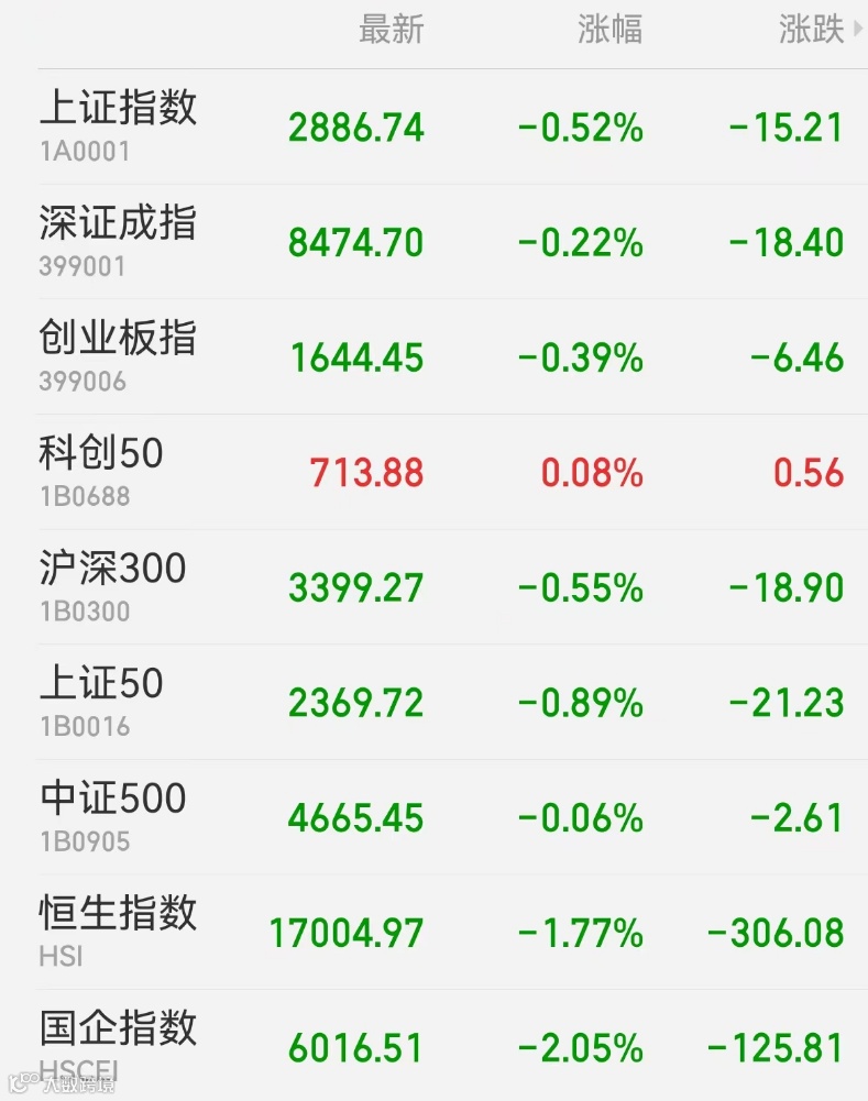 1、A股:A股全天弱势下行,市场交投清淡,汽车股整体转暖,新能源全天强势,沪深300ETF午后再度出现放量情形。截至收盘,上证指数跌0.52%报2886.74点,深证成指跌0.22%,创业板指跌0.39%,万得全A跌0.21%,万得微盘股指数涨1.06%,万得A500跌0.53%。市场成交额5930.2亿元,北向资金净卖出65.82亿元,贵州茅台、宁德时代分别遭净卖出8.46亿元、6.44亿元。