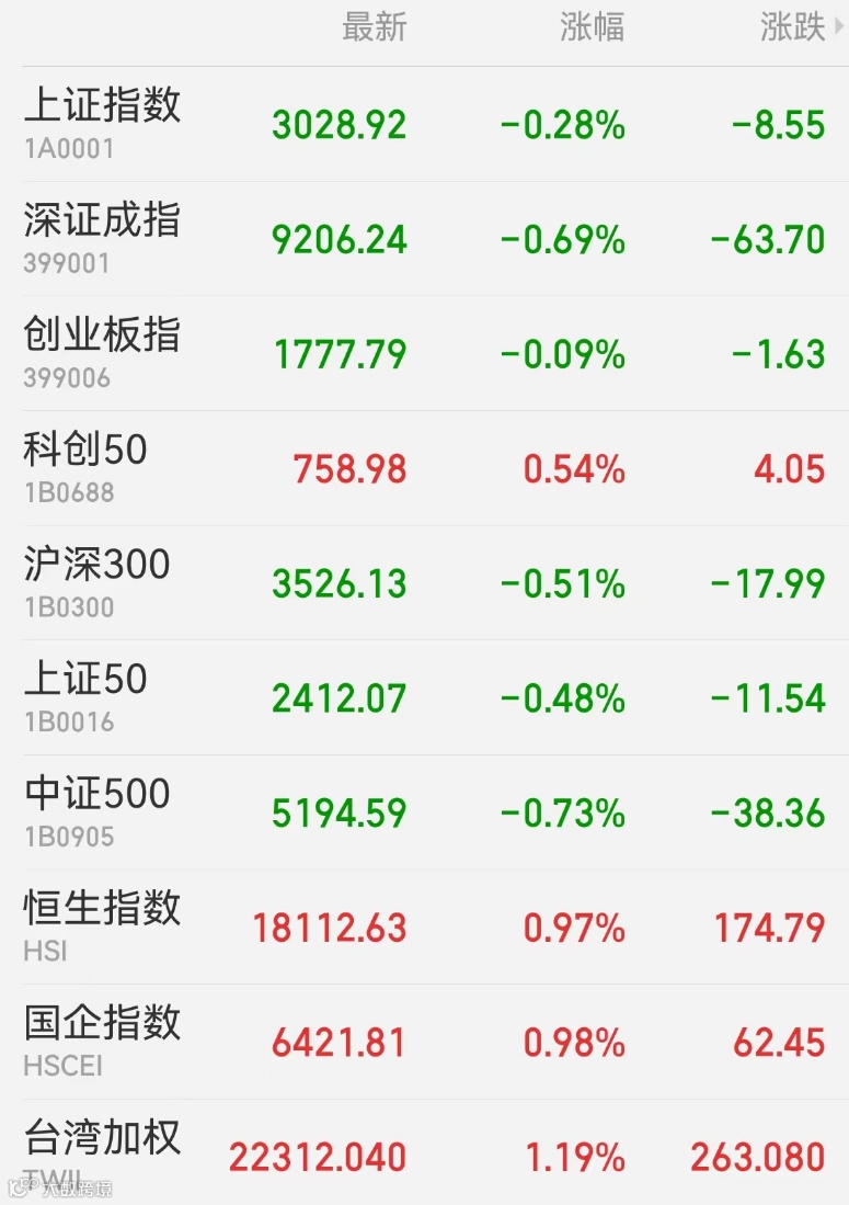 1、A股:A股震荡走低,科创板次新股批量涨停,半导体产业链活跃,大消费以及资源股出现回调。截至收盘,上证指数跌0.28%报3028.92点,深证成指跌0.69%,创业板指跌0.09%,科创50指数涨0.54%,北证50指数跌0.26%,万得全A跌0.49%,万得双创涨0.32%。市场成交额7551亿元。北向资金净卖出63.06亿元,五粮液、贵州茅台分别遭净卖出6亿元、4.47亿元。其中贵州茅台连续4日遭大额卖出累计超50亿元;五粮液连续9日遭净卖出。