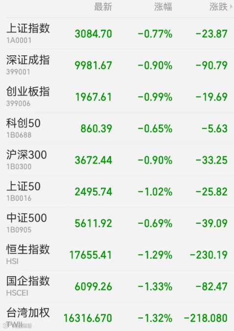 1、A股:A股核心资产继续遭大资金抛售,全天超4000股下跌,上证指数尾盘完全回补印花税缺口,收盘跌0.77%报3084.7点,深证成指跌0.9%失守10000点整数关口,创业板指跌0.99%,北证50跌0.46%,万得全A、万得双创跌约0.7%。A股全天成交5798亿元,北向资金净卖出43亿元,贵州茅台、宁德时代、中国平安分别遭净卖出4.68亿元、4.43亿元、3.36亿元。