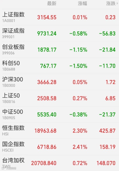 2、港股:香港恒生指数收涨2.30%报18963.68点,恒生科技指数涨0.38%,恒生中国企业指数涨2.41%。盘面上,金融股走高,香港交易所涨逾7%,建设银行涨近7%;内房股表现强势,万科企业涨逾5%。大市成交1710.01亿港元,南向资金净买入65.05亿港元,中国银行获净买入9.04亿港元居首,快手遭净卖出4.6亿港元最多。中国台湾加权指数收涨0.72%,报20708.84点。