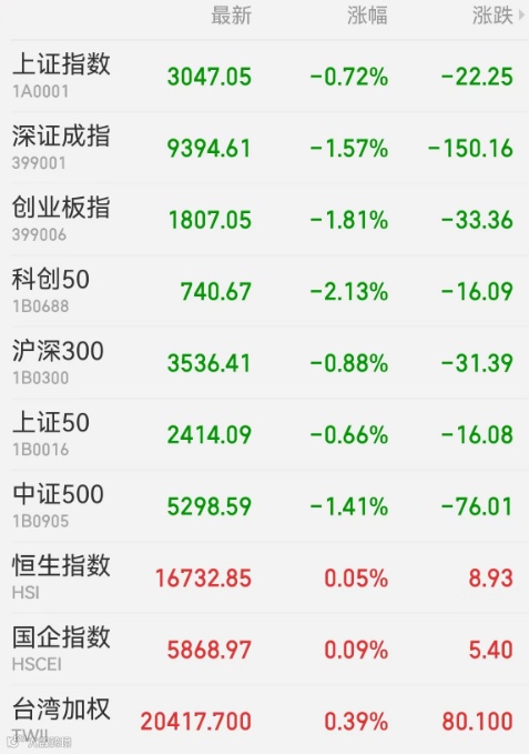 1、A股:清明假期后首个交易日,A股震荡走弱,黄金、电力板块逆市上涨。截至收盘,上证指数下跌0.72%报3047.05点,深证成指跌1.57%,创业板指跌1.81%,北证50跌4.24%,科创50跌2.13%,上证50跌0.66%,深证50跌1.45%,万得全A跌1.40%,万得微盘股指数跌4.53%,万得双创跌2.47%。A股成交额为9357.5亿元,北向资金净卖出30.45亿元。其中,贵州茅台遭净卖出10.73亿元最多,汇川技术获净买入3.07亿元居首。