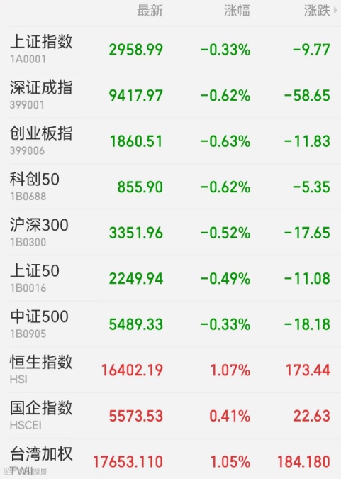 1、A股:A股持续震荡,白酒股再度走弱,国企改革概念持续火热。截至收盘,上证指数下跌0.33%,报2958.99点,深证成指跌0.62%,创业板指跌0.63%,北证50指数涨0.79%,科创50跌0.62%,上证50跌0.49%,深证50跌0.63%,万得全A跌0.43%,万得微盘股指数涨0.31%,万得双创跌0.67%。A股成交额为7579.5亿元。北向资金净买入34.63亿元,万华化学获净买入4.8亿元居首,贵州茅台遭净卖出2.2亿元最多。