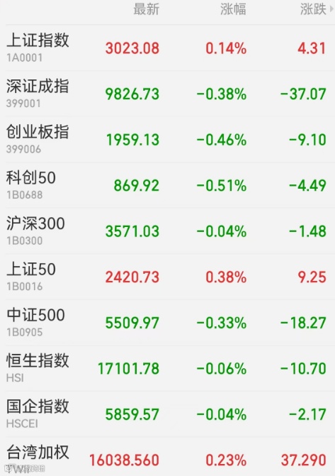 1、A股:A股跳空高开,贵州茅台开盘逼近涨停,随后三大指数回落,整体呈现缩量整理态势。上证指数收涨0.14%报3023.08点,深证成指跌0.38%,创业板指跌0.46%,科创50指数跌0.51%,万得全A跌0.07%,万得双创跌0.31%。市场成交额8135.5亿元,北向资金净卖出20.82亿元,比亚迪再遭大幅减仓近7亿元,贵州茅台获大幅加仓11.5亿元。