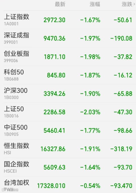 2、港股:港股低开低走,恒生指数收跌1.91%报16327.86点,恒生科技指数跌2.05%,恒生国企指数跌1.64%。恒生行业指数全线下跌,原材料、科技、消费板块跌幅居前。大市成交1180.25亿港元;南向资金净买入45.62亿港元,香港交易所遭净卖出6.26亿港元。中国台湾加权指数收跌0.54%。