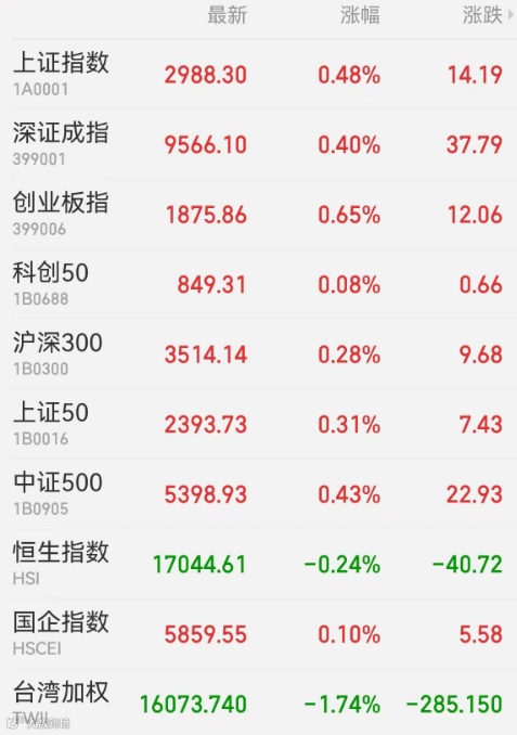 1、A股:A股延续反弹,华为汽车概念爆发,江淮汽车等多股涨停,圣龙股份巨震“炸板”;C天元持续被爆炒,连续两日盘中触发临停。上证指数收涨0.48%,报2988.30点,深证成指涨0.40%,创业板指涨0.65%,科创50涨0.08%,深证50涨0.30%,上证50涨0.31%,北证50涨0.53%,万得全A涨0.37%,万得双创涨0.53%。A股成交额为8430.4亿元,北向资金净买入12.27亿元,结束连续8日净卖出,科大讯飞获净买入3.05亿元居首,贵州茅台遭净卖出3.48亿元最多。