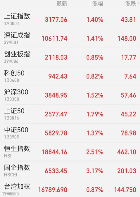 1、A股:A股放量拉升,顺周期板块大爆发。上证指数收涨1.40%,报3177.06点,深证成指涨1.41%,创业板指涨0.85%,科创50涨0.82%,上证50涨1.79%,万得全A涨1.47%,万得双创涨0.90%。A股成交额为8883.7亿元,北向资金净买入68.84亿元,招商银行获净买入5.1亿元居首,宁德时代遭净卖出3.25亿元最多。