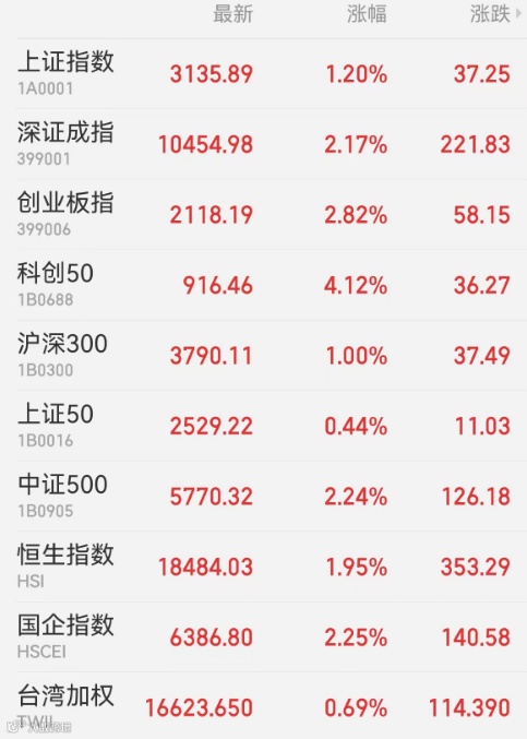 1、A股:A股持续上行,成交额再破万亿,科创板行情点燃。机器人概念股爆发,昊志机电等多股“20cm涨停”。上证指数收涨1.20%,报3135.89点,深证成指涨2.17%,创业板指涨2.82%,科创50指数涨4.12%,北证50涨2.26%,万得全A涨2.04%,万得双创涨4.14%。A股成交额为10384亿元,北向资金净卖出6.8亿元,平安银行遭净卖出6.04亿元居首,比亚迪获净买入8.53亿元最多。