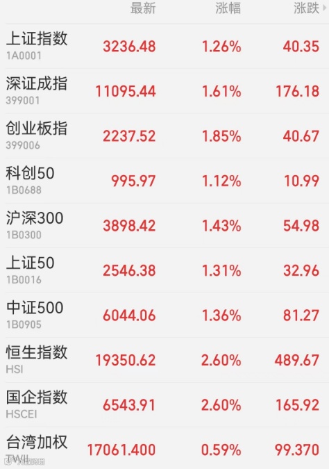 1、A股:A股单边上行,半导体行业爆发,存储器方向领涨;AI应用概念午后发力,CPO领域表现出色;传媒、白酒、券商、医药涨幅靠前;新能源车产业链降温。上证指数收涨1.26%报3236.48点,深证成指涨1.61%,创业板指涨1.85%,科创50指数涨1.12%,北证50张0.59%,万得全A涨1.35%,万得双创涨1.56%。市场成交额9222.1亿元;北向资金实际净买入135.85亿元,创5个月来新高;宁德时代、贵州茅台分别获加仓8.85亿元、7.29亿元,均连续4日获净买入;净买入超3亿元的还有五粮液、东方财富、比亚迪、药明康德、中国平安;隆基绿能遭净卖出3.61亿元。