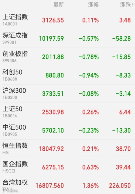 2、港股:香港恒生指数收涨0.21%,报18047.92点,恒生科技指数涨0.44%,恒生国企指数涨0.63%。能源、有色、电讯板块涨幅居前,黄金股普涨,中国黄金国际涨8%;内房股多数回落,融创中国跌近9%。大市成交816.04亿港元,南向资金净买入26.12亿港元,中国海洋石油获净买入3.82亿港元居首,腾讯控股遭净卖出1.74亿港元最多。中国台湾加权指数收涨1.36%,报16807.56点。