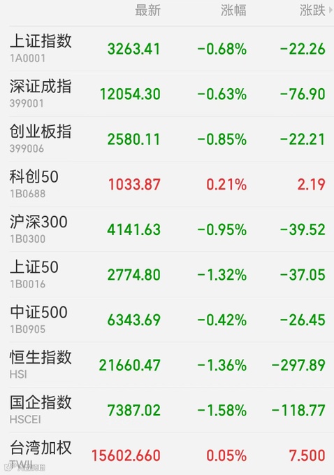2、港股:港股全天弱势震荡,恒生指数收跌1.36%报21660.47点,周跌4.53%;恒生科技指数跌1.33%报4634.19点,周跌3.72%;恒生国企指数跌1.58%报7387.02点,周跌4.97%。大市成交1299.6亿港元。恒生行业板块全线下跌,物管、黄金、大金融跌幅居前,碧桂园服务跌超7%领跌蓝筹,中金公司跌近5%。科技、新能源汽车股普跌,百度跌超4%,理想汽车跌4%,阿里巴巴跌近3%。南向资金净卖出6.04亿港元,腾讯控股遭净卖出7.92亿港元。中国台湾加权指数收盘涨0.05%。