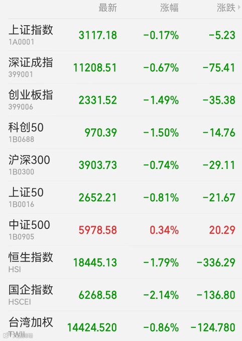 2、港股:港股弱势震荡,恒生指数收盘跌1.79%报18444.62点,盘中续刷3月以来新低;恒生科技指数跌3.03%,恒生国企指数跌2.16%。大市成交813.03亿港元。科技、光伏、水泥股跌幅居前,航运、油气股上涨。腾讯音乐上市首日收报18.22港元,较美股小幅溢价。中国台湾加权指数收跌0.86%。