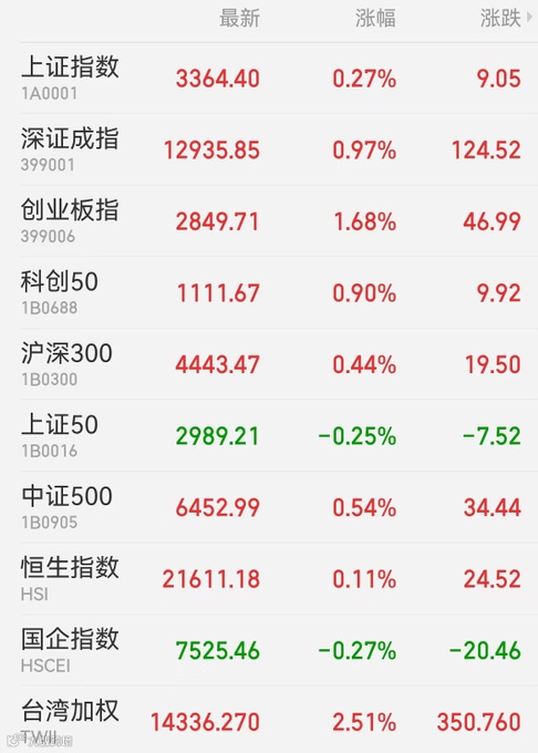 1、A股:沪深三大股指集体走升,上证指数收盘涨0.27%报3364.4点,创业板指涨1.68%报2849.71点,深证成指涨0.97%报12935.85点,万得双创报涨1.24%2979.86点,万得全A涨0.68%报5336.91点;大市成交1.05万亿元。市场资金集中火力猛攻新能源方向,新能源汽车、锂电、储能、光伏、充电桩、特高压板块你追我赶,中通客车上演“地天板”,比亚迪、宁德时代、阳光电源分别获得主力净流入18.9亿元、16.9亿元、16.4亿元;海运、稀土、基本金属、煤炭、工程机械、钢铁板块造好。