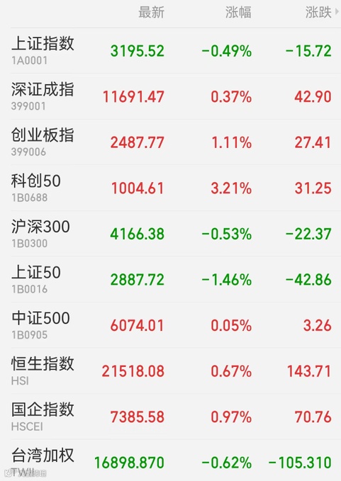1、A股:上证指数全天低位整理为主,创业板指一度跌超2%,创阶段新低后反抽。截至收盘,上证指数跌0.49%报3195.52点,创业板指涨1.11%报2487.77点,深证成指涨0.37%报11691.47点,科创50涨3.21%报1004.61点;大市成交缩窄至0.78万亿元。盘面上,东方证券跌停拖累券商股,招商银行放量下跌令银行股承压,保险股跟随下滑;煤炭、钢铁、白酒板块纷纷调整,兖矿能源一度接近跌停;房地产板块午后继续扩大跌幅。半导体、光伏两大热门赛道复苏,养殖、汽车配件板块造好。