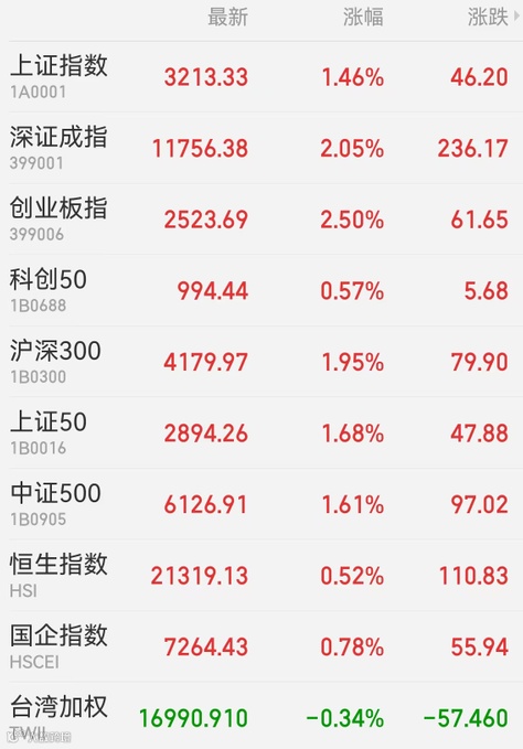 1、A股:上证指数早盘震荡走软,午后下探至3140点后反弹,三大指数集体火箭发射,多头猛攻券商、白酒、餐饮旅游、家电板块。截至收盘,上证指数报3213.33点,涨1.46%;创业板指报2523.69点,涨2.50%;深证成指报11756.38点,涨2.05%;大市成交0.92万亿元。盘面上,旅游出行指数大涨近9%,中国中免、吉祥航空等20余股涨停。白酒股涨声一片,山西汾酒、金种子酒涨停,五粮液涨超6%。券商股方面,中银证券、红塔证券上板。地产股逆向而行,阳光城、信达地产、中交地产等十余股跌停,万保招金集体飘绿。