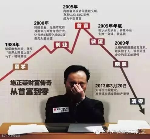 当施正荣创建的尚德企业在美国股市冲高到每股80美元的时候,他真的是站在人生事业的高峰,睥睨天下,可以说这一生应该荣华富贵不尽了。谁曾想2008年之后,突然市场形势逆转,尚德企业股价飞流直下,到2013年初竟然跌破1美元,成为资不抵债濒临破产的公司。