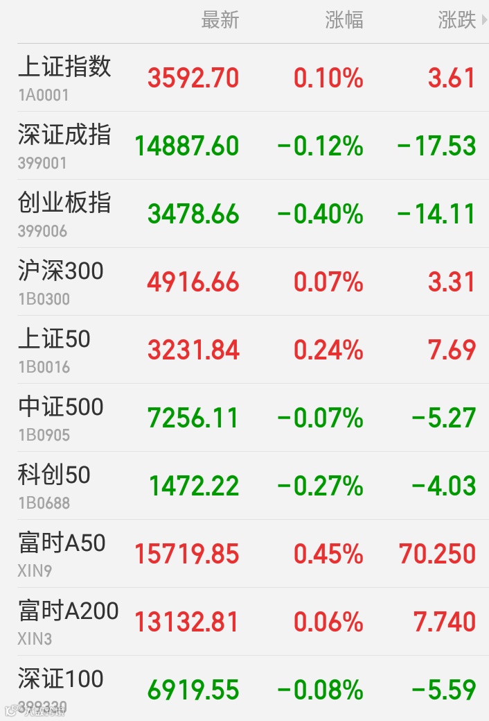 1、A股:A股窄幅震荡,纺织服装板块走势强劲,美邦服饰等多股涨停,酿酒、医药股走高,九安医疗连续8日涨停,元宇宙题材活跃。截止收盘,上证指数上涨0.10%报3592.70点,深证成指跌0.12%,创业板指跌0.40%,科创50指数跌0.27%,万得全A跌0.03%。两市成交额连续24个交易日突破万亿,北向资金净买入23.70亿元,五粮液获净买入12.61亿元居首,伊利股份遭净卖出5.97亿元最多。