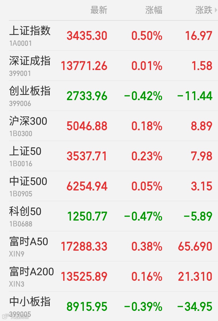 1、A股:沪指震荡攀升录得二连涨,创业板指走弱。上证指数收涨0.5%报3435.3点,深成指涨0.01%,创业板指跌0.42%;两市全天成交额7578亿元。资源股表现抢眼,碳中和概念延续分化,科技股普遍低迷,煤炭领涨,次新股持续活跃。