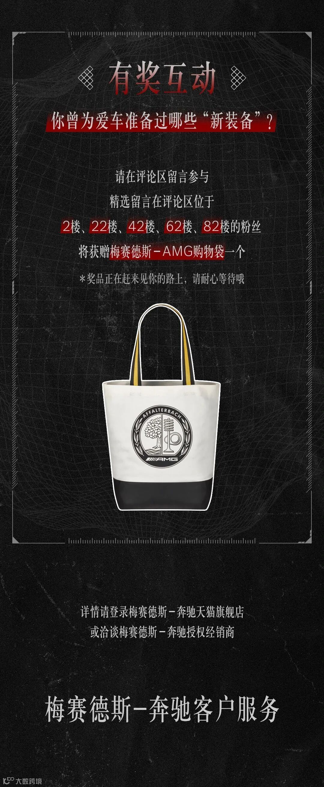 2.本次活动会在评论区精选出符合活动相关话题的留言,其中精选留言在评论区位于2楼、22楼、42楼、62楼、82楼的粉丝即可免费获得梅赛德斯-AMG购物袋一个;