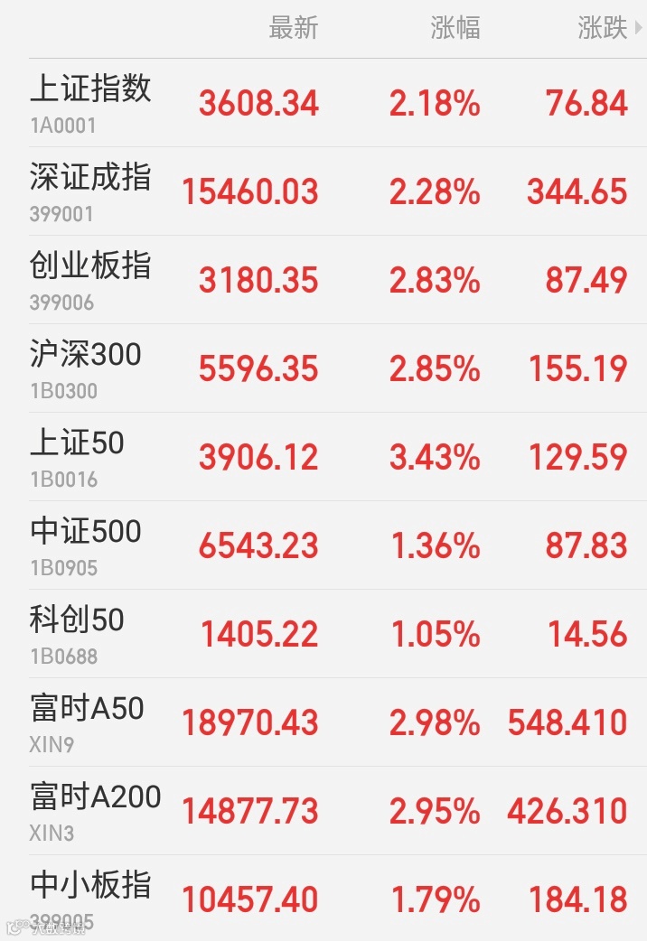 1、A股:A股早盘温和反弹,券商板块午后崛起,带领上证指数自2015年12月以来首次站上3600点。两市成交额连续7日突破1万亿元。上证指数收涨2.18%报3608点;深证成指涨2.28%,创业板指涨2.83%;万得全A报涨2.12%。