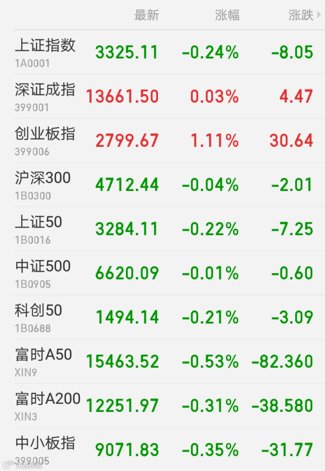 1、A股:A股探底回升,医药、军工板块飙升力撑大市。上证指数收跌0.24%报3325.11点,创业板指涨1.11%报2799.67点,深证成指涨0.03%报13661.5点,科创50指数跌0.21%报1494.14点;万得全A跌0.06%报5223.61点,全天成交1.22万亿元,上日为1.16万亿元。北向资金净卖出36.54亿元,五粮液再遭净卖出7.08亿元居首,中国平安逆势获净买入3.67亿元。