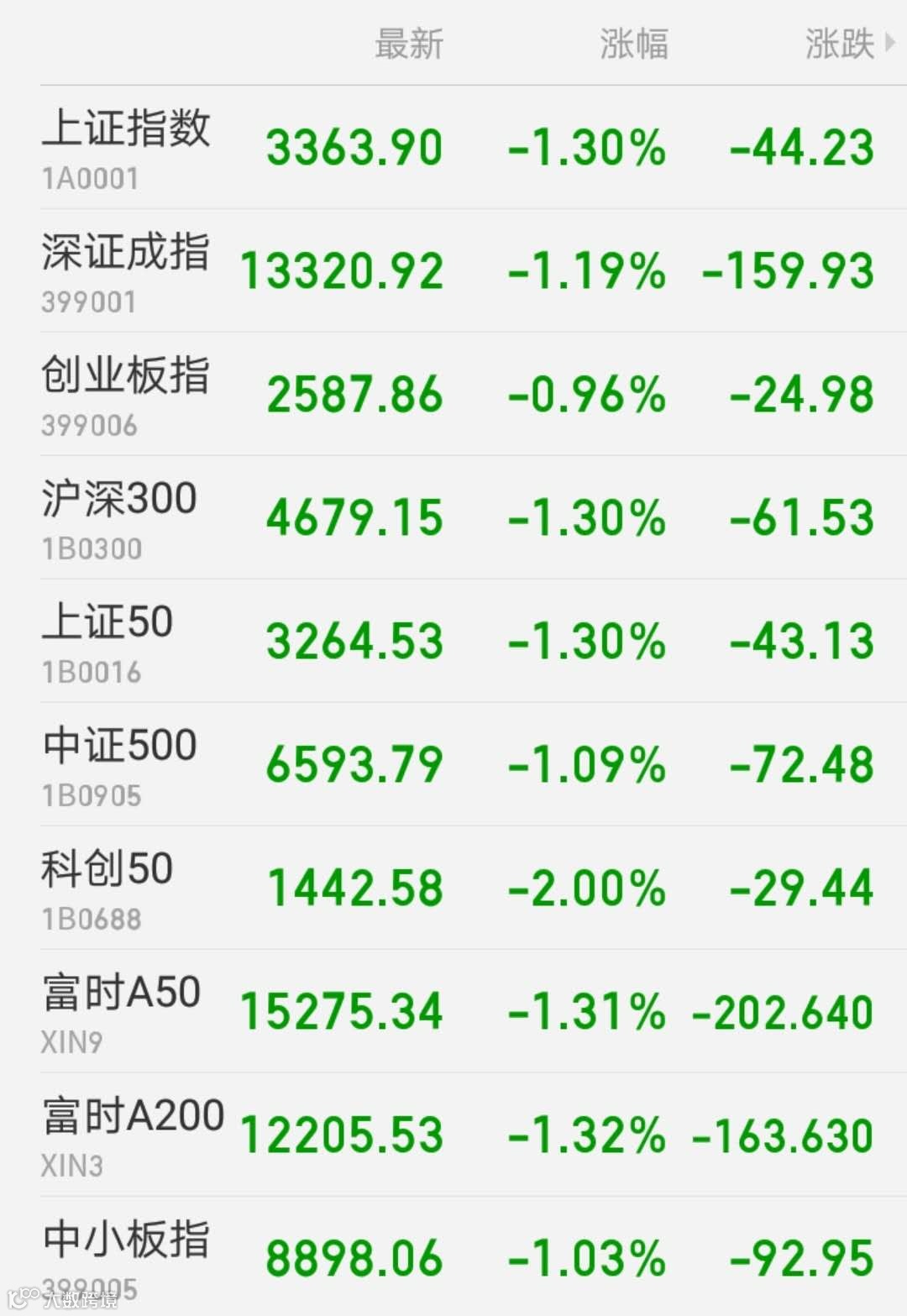 1、A股:A股全天基本维持调整态势,金融、军工、农业板块领跌,数字货币、苹果、影视、广电等板块逆市活跃。上证指数收跌1.3%报3363.9点,深证成指跌1.19%,创业板指跌0.96%,科创50跌2%;万得全A跌1.23%,成交8603亿元。
