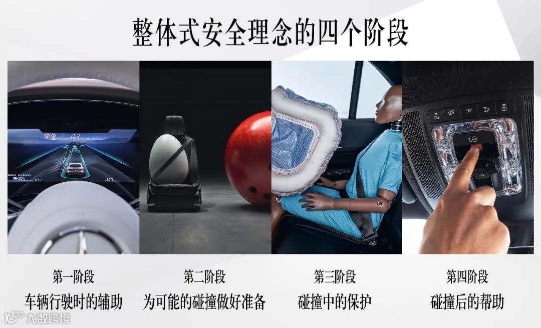 在20世纪九十年代,梅赛德斯-奔驰提出了“整体式安全理念”,将主动安全与被动安全相融合,兼顾车辆行驶时的辅助、碰撞前的预防、碰撞中的保护及碰撞后的援助,为驾乘者提供贯穿始终的安全守护。同时,梅赛德斯-奔驰借鉴过去50多年来对超过5,000多起真实事故研究的分析,持续优化车辆在事故中的安全表现。
