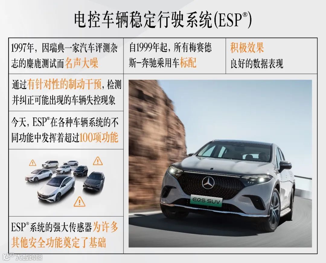 伴随着科技的进步,梅赛德斯-奔驰也持续推动主动安全科技的演进,比如,梅赛德斯-奔驰率先将电控车辆稳定行驶系统ESP®于1999年标配于全系车型,如今更将ESP®系统与100多种车辆功能协同工作,不断提升车辆在各种行驶状态下的安全性与舒适性,为出行增添多一层安全支持。